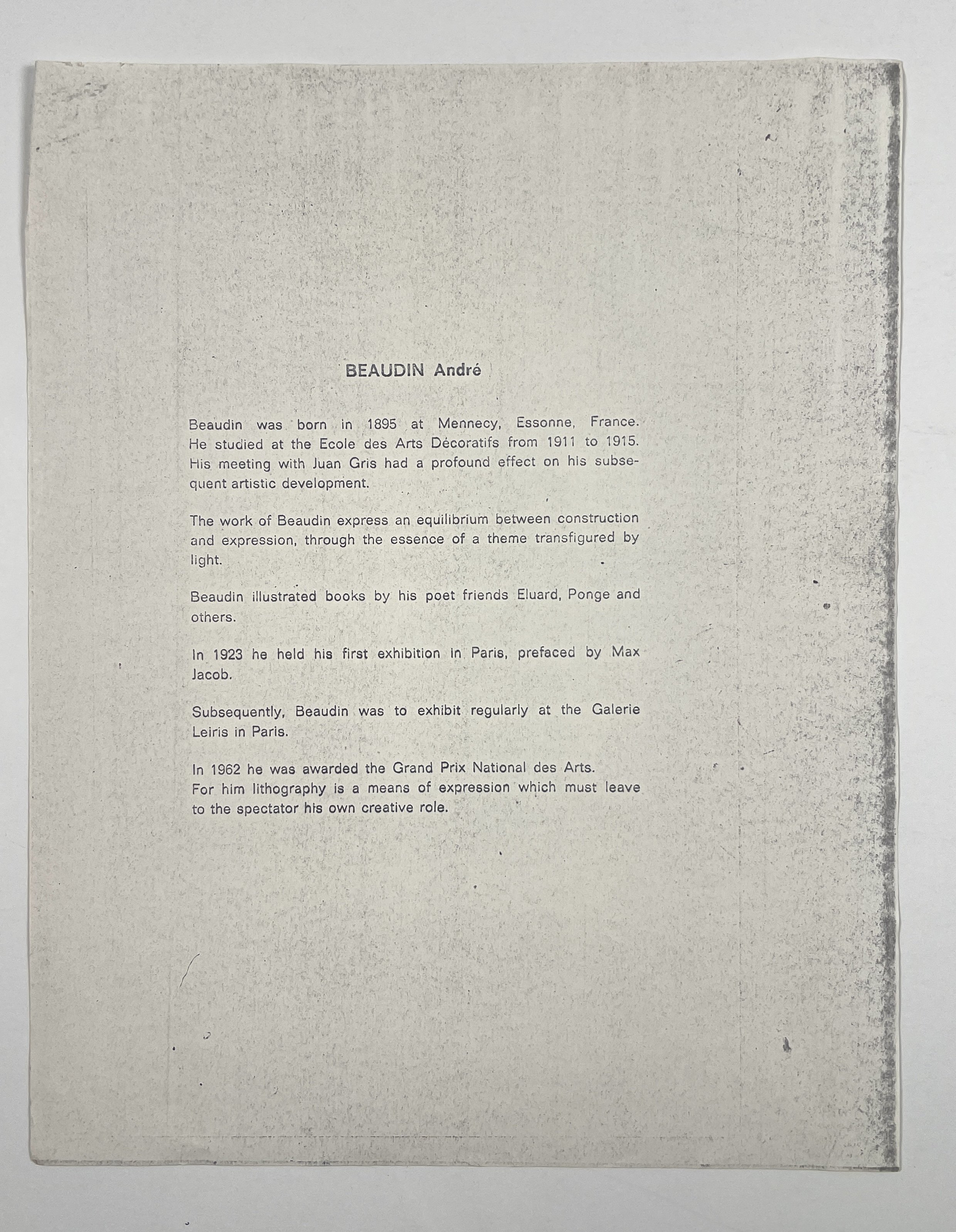 In 1962, Beaudin was awarded the prestigious Grand Prix National des Arts in recognition of his contribution to modern art. His work is represented in major museum collections worldwide, including the Centre Georges Pompidou, Musée National d’Art Moderne, Museum of Modern Art (New York), Tate Gallery, and numerous international institutions. He died in Paris in 1979.
