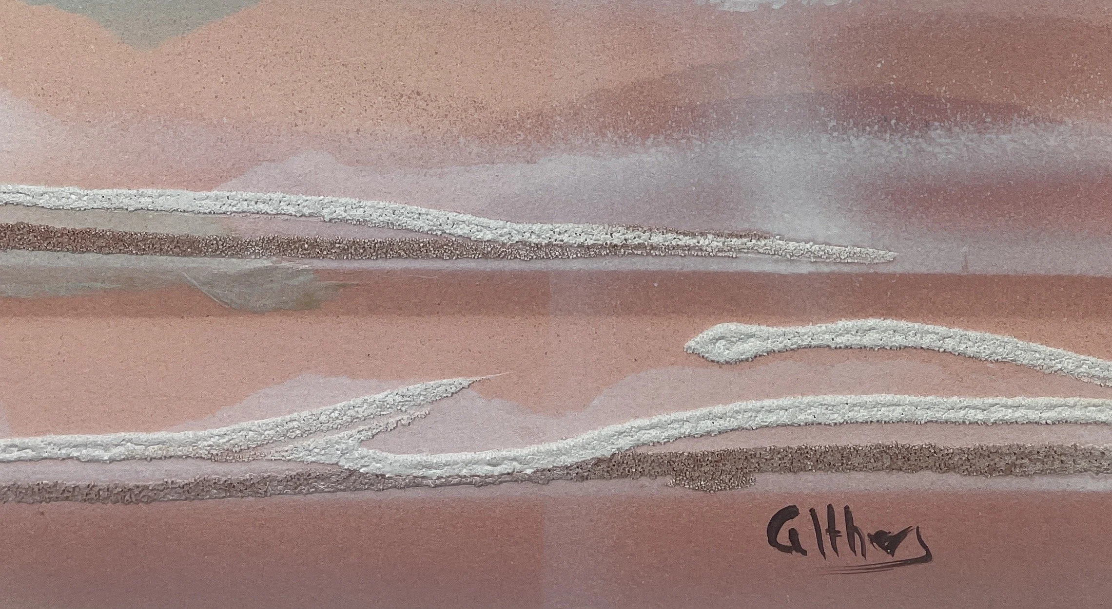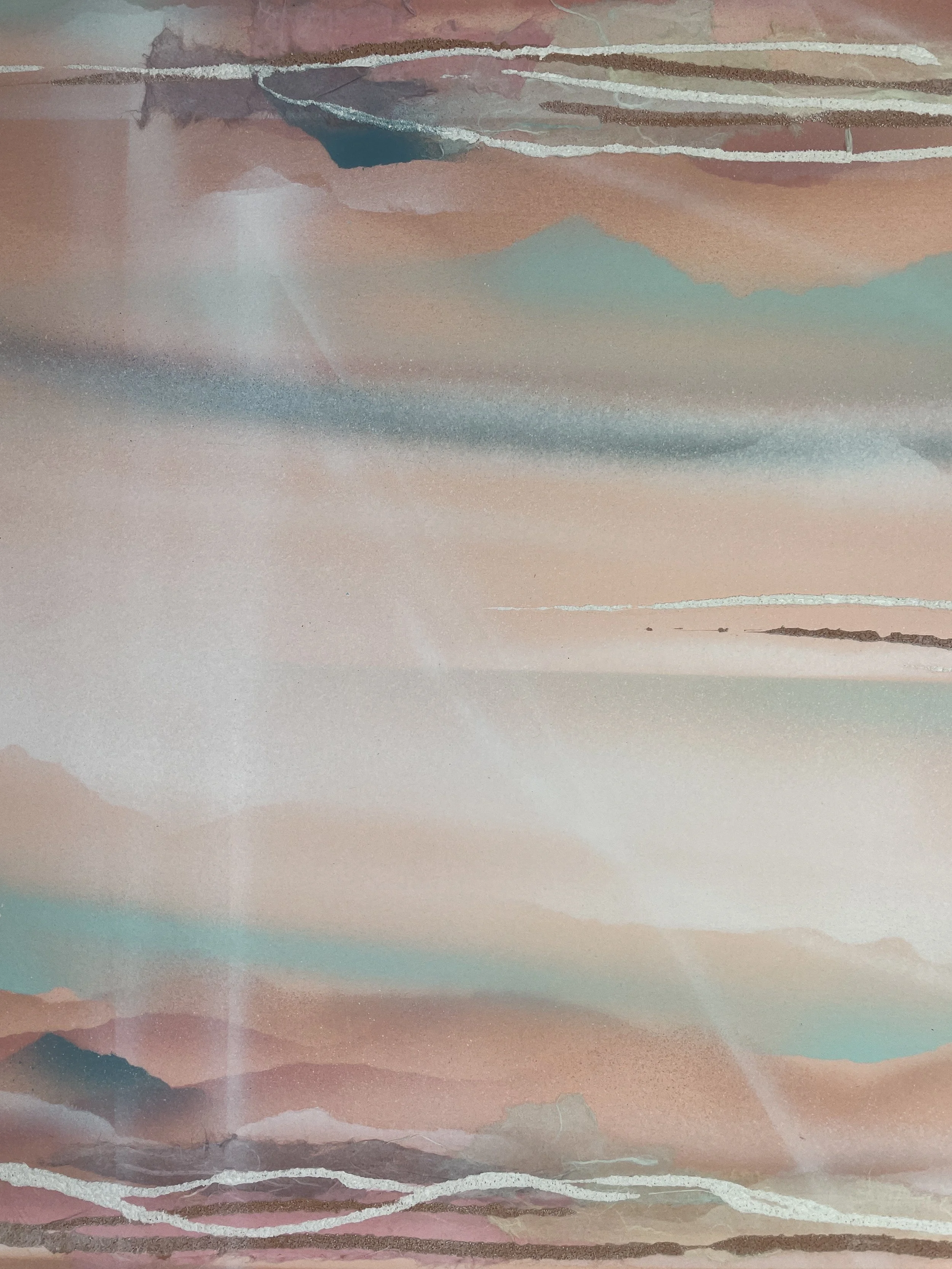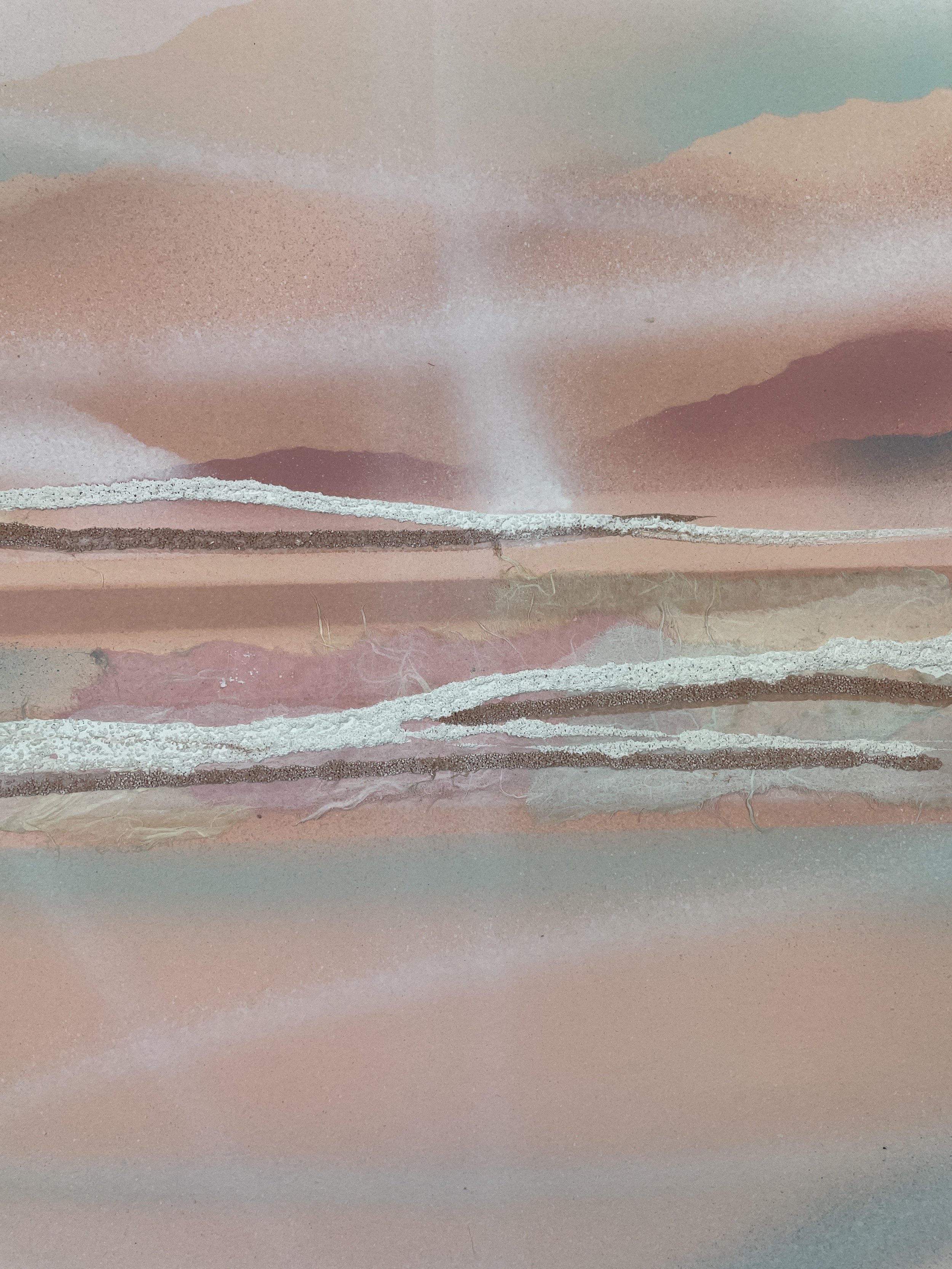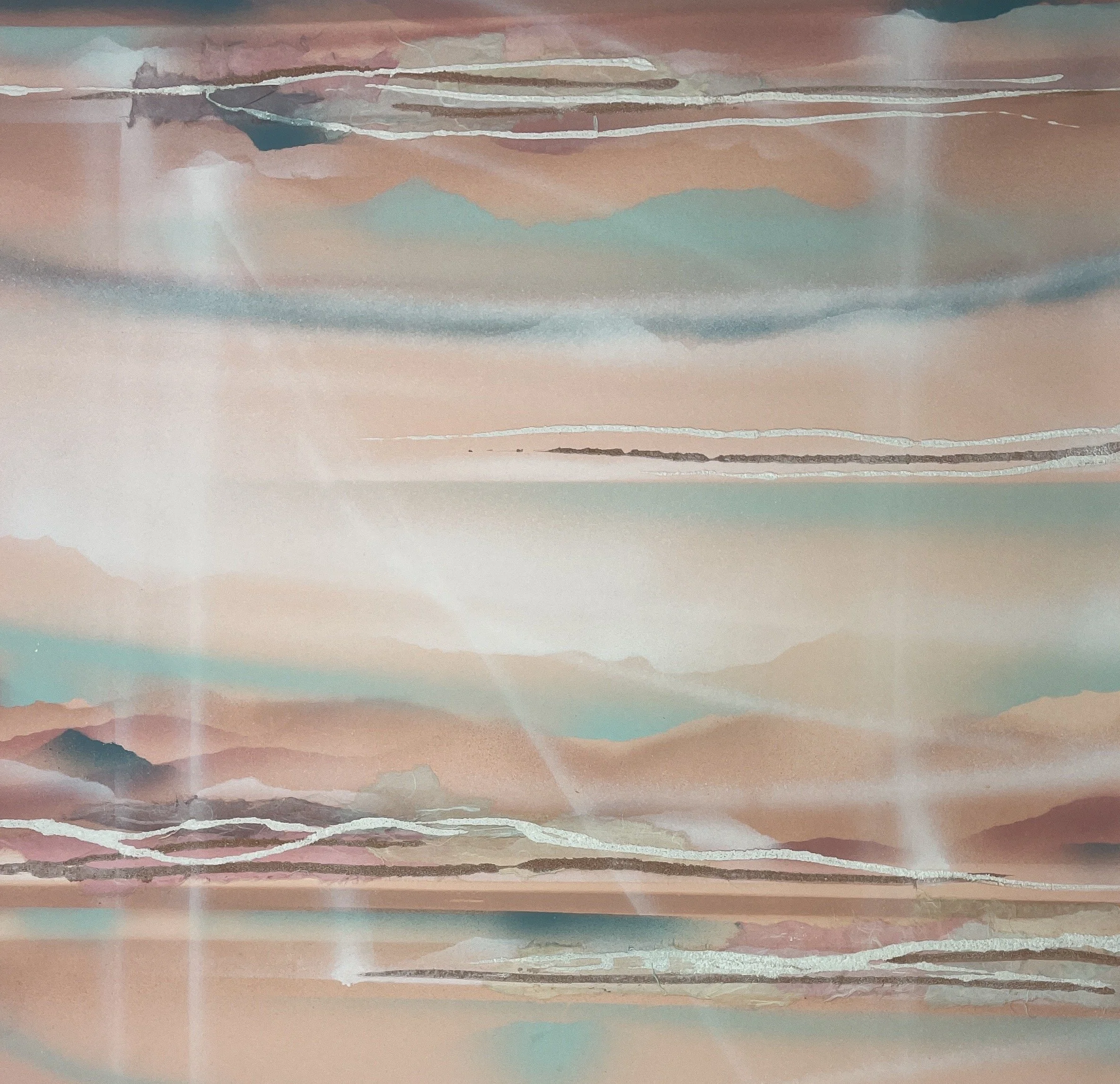 Jones’s signature innovation was rust-transference, discovered when metal gallery fixtures left oxidation marks on paper. Recognizing the expressive potential, she began intentionally cultivating rust, moisture, and pigment to interact and create organic, spontaneous forms. Her work was featured in several small NYC gallery group shows and sold to private collectors throughout the region.