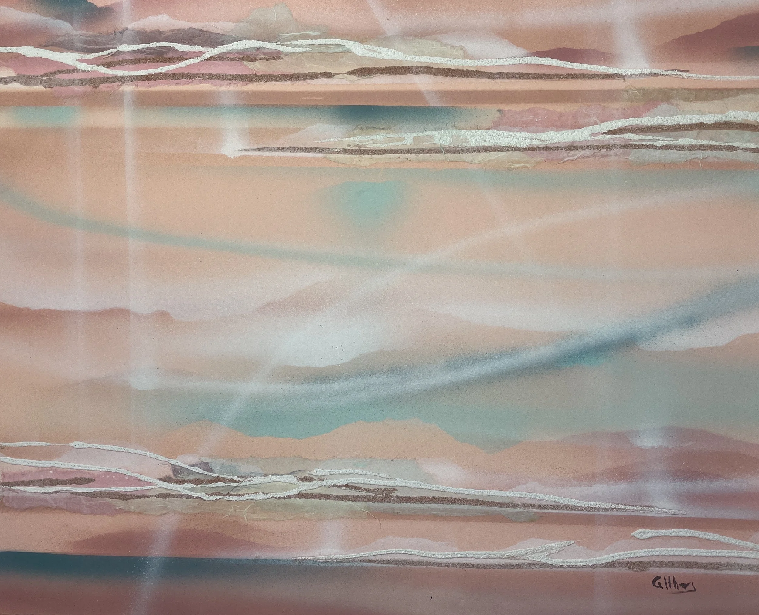 This 18×24 mixed-media abstraction represents Meredith Jones’s most innovative period while working in the New York City art world during the 1960s. The artwork showcases her signature fusion of watercolor, ink, and rust-transfer oxidation, a technique she pioneered while employed at a Manhattan gallery, where she had access to metal shelving, damp studio environments, and archival papers. By allowing rust to seep naturally into the sheet, Jones created spontaneous textures, chemical blooms, and organic “growth” structures that became a hallmark of her style.