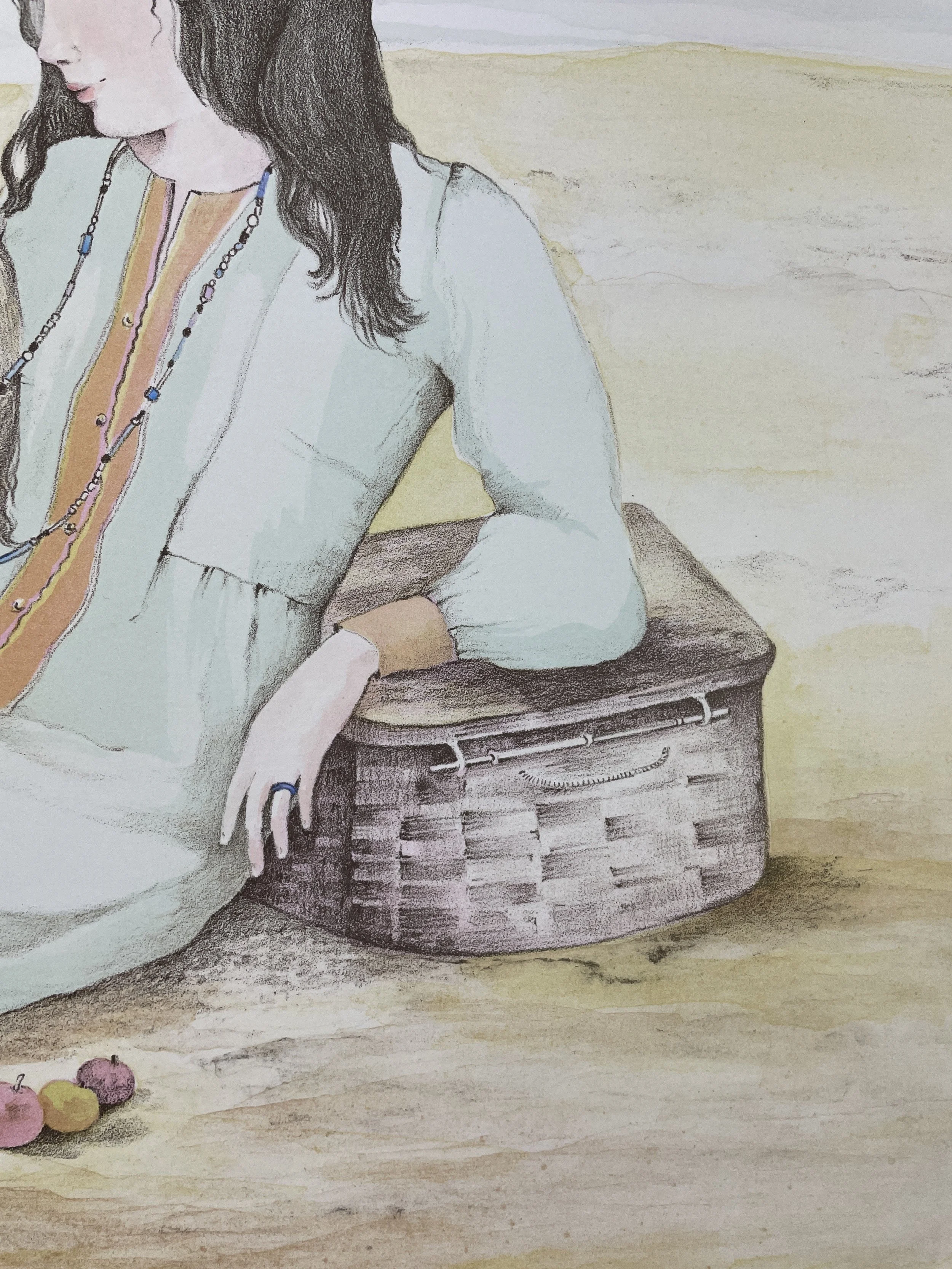 Mary Vickers’ STRING OF PEARLS (1976) is a signed and numbered limited-edition lithograph (1/200) that captures an intimate, deeply emotional moment between a mother and her sleeping infant. Rendered in Vickers’ signature sepia tonal drawing style, this work highlights the soft textures of fabric, gentle expressions, and the quiet poetry of maternal tenderness. Collectors value this early-edition print for its technical finesse, emotional depth, and pristine provenance from Mitch Morse Gallery.